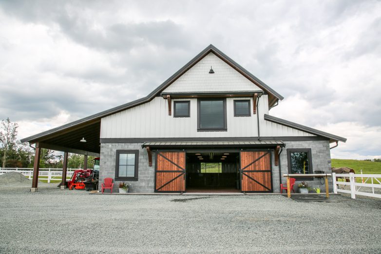 This durable 3-stall barn features extra-large stalls and a nontraditional barn aisle. Located in Abbotsford, British Columbia, this barn was completed in 2018 by Quinis Design Works. The project took about a year from concept design to completion. The entire 17.6 acre property is in a flight line of a city airport. Quinis had to cooperate with N.A.V. Canada for structure approval (aeronautical assessment). Masonry blocks give the barn a modern look, plus they are extremely durable…