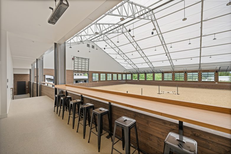 The 100 by 180 foot indoor riding arena features a staging area, a brightly lit riding surface, and in-wall jump storage. A seven-port garage with bedding storage and utility housing is attached to the arena structure. The owners value the air quality inside the arena as a game changer for their lead trainer, who has asthma. The horses love the bright environment, and trainers note it is very transferable to competition riding…