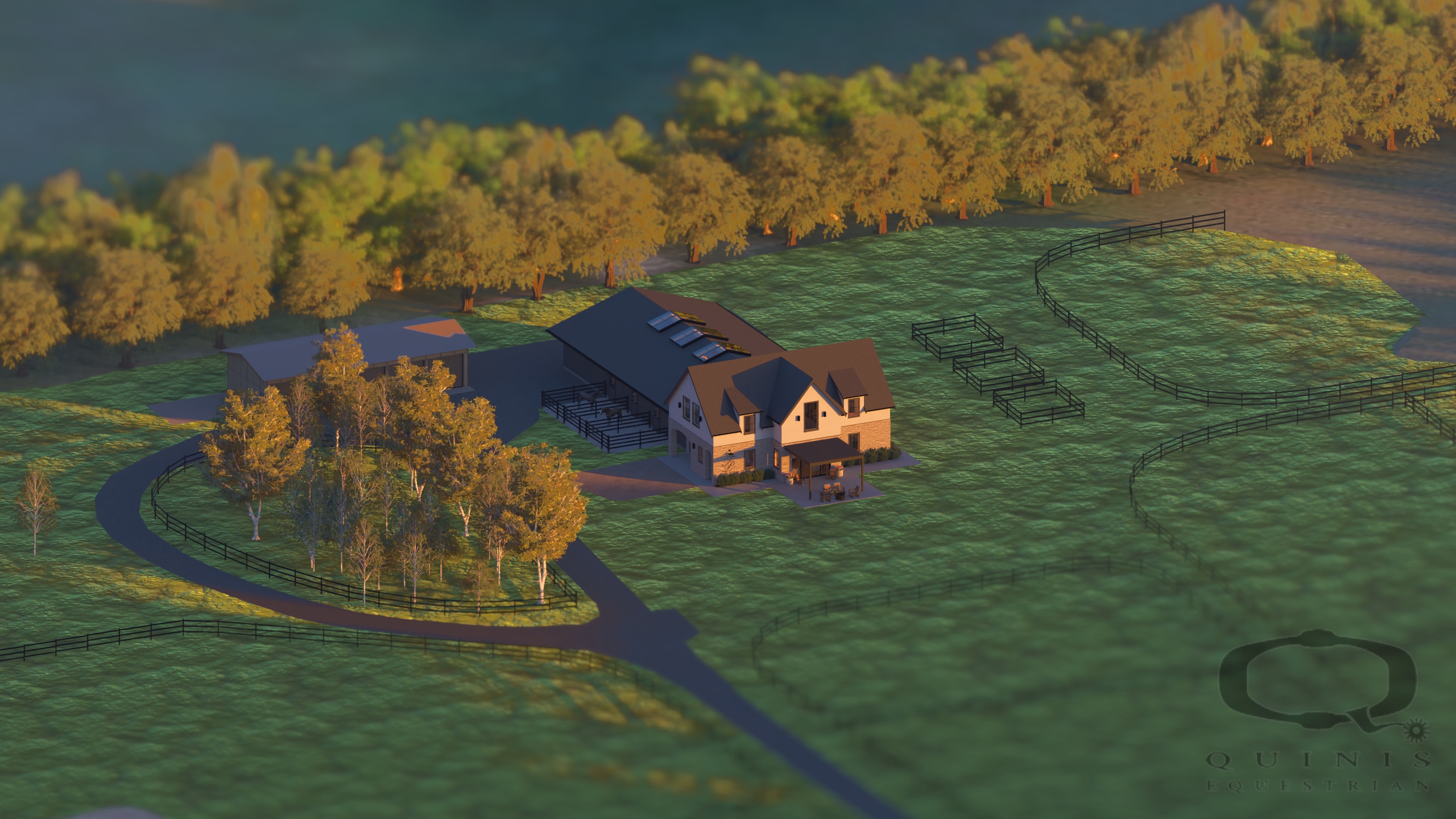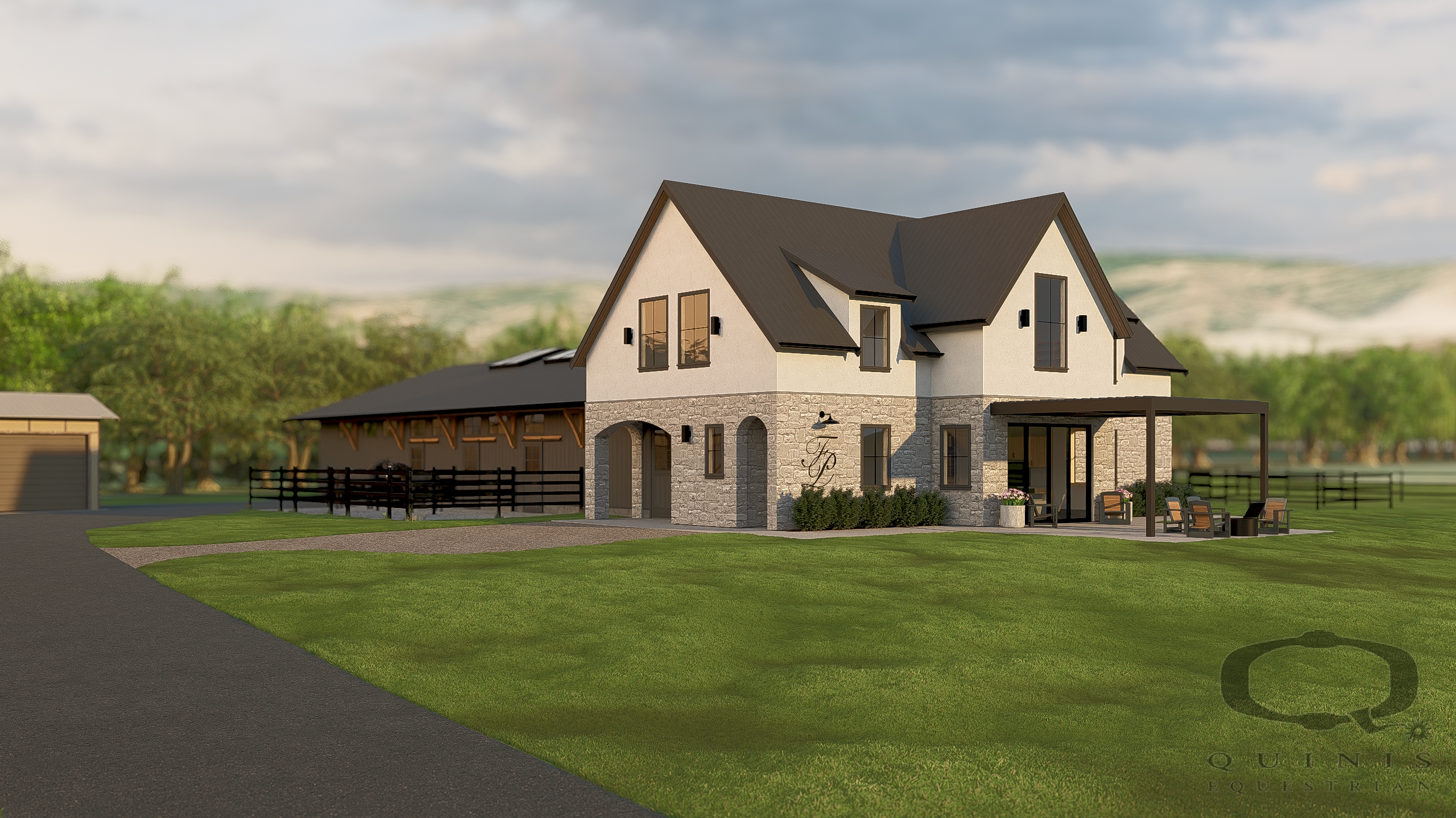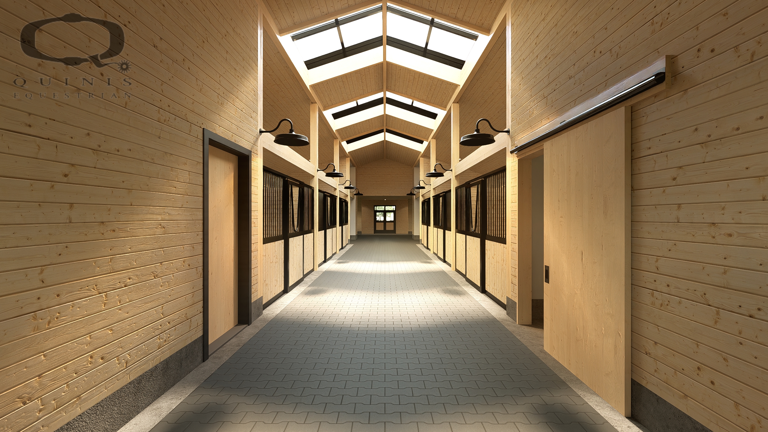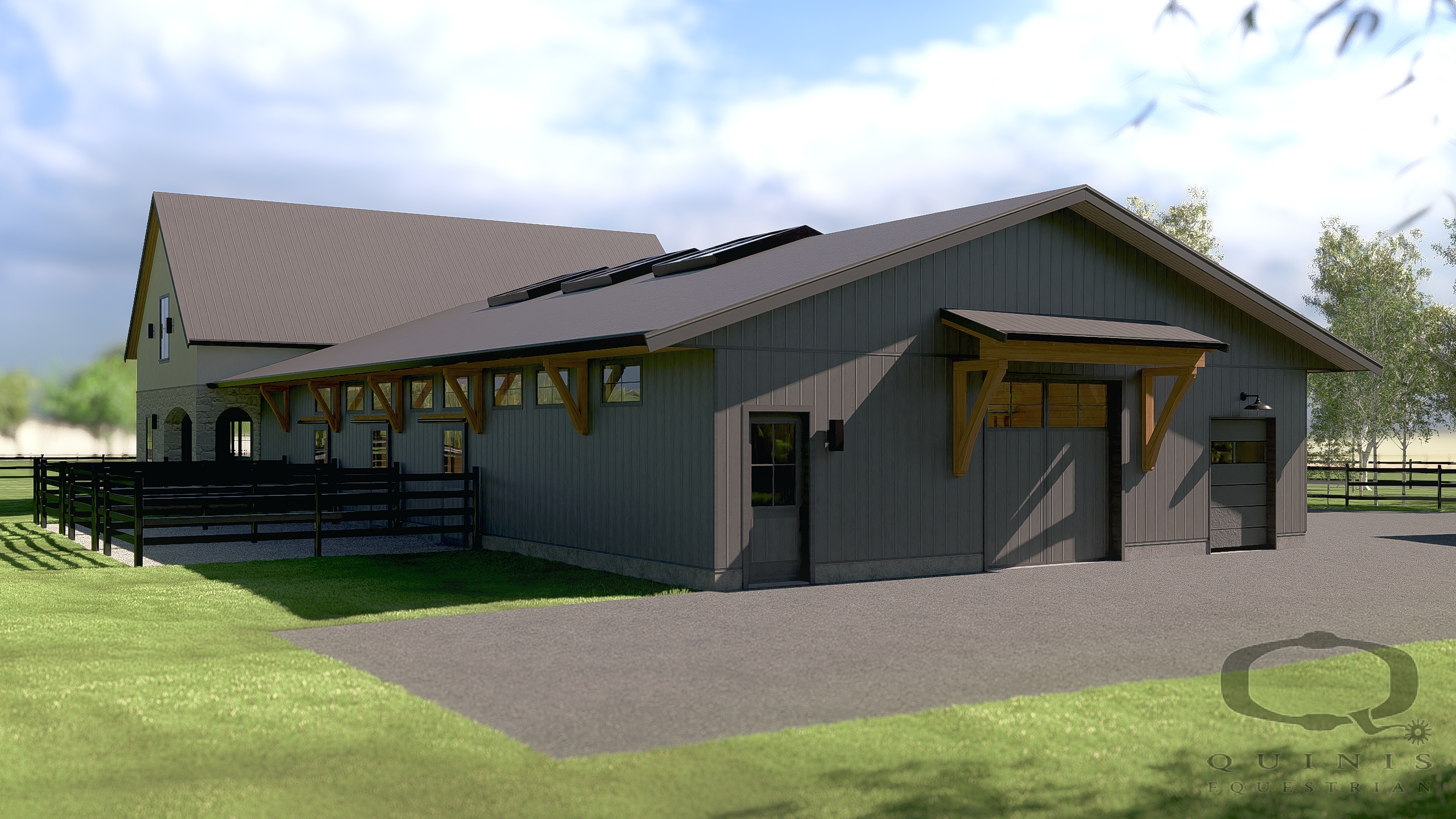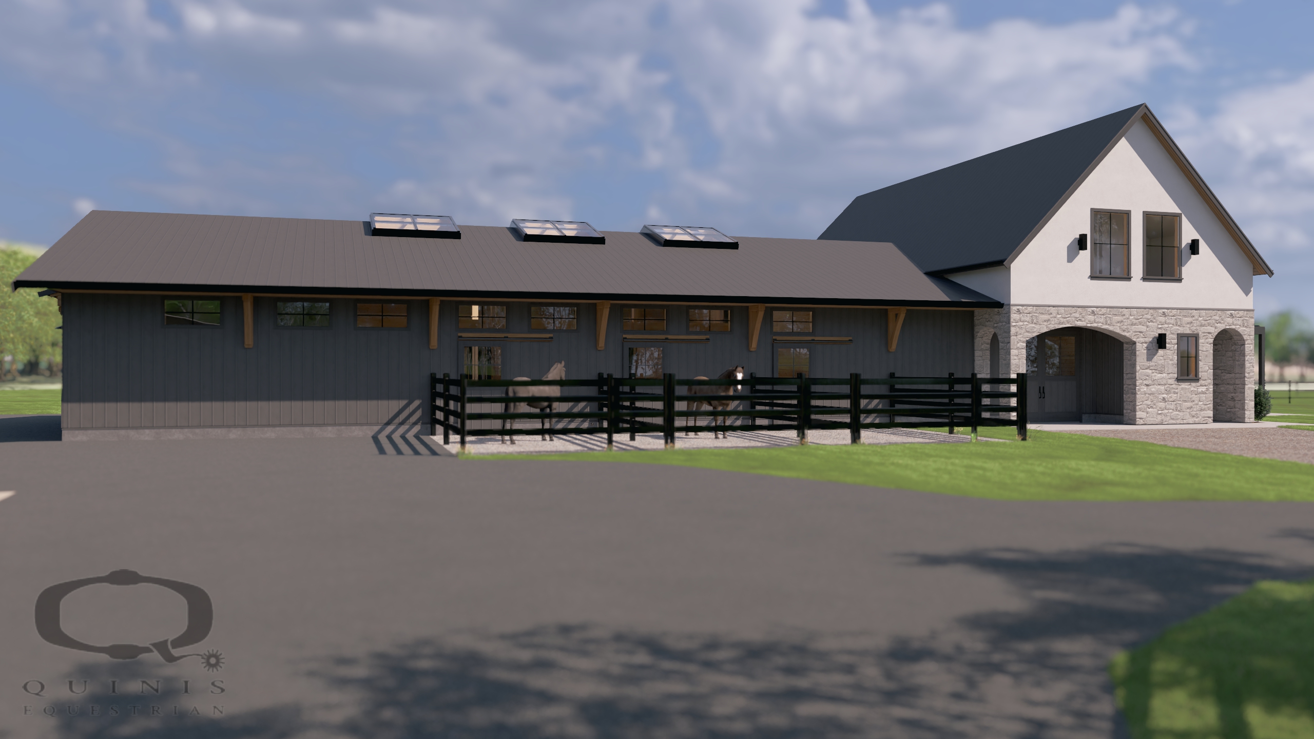 This design showcases six stalls, a hay & bedding room, tack, groom and wash stalls with blanket storage, and a covered indoor/ outdoor lounge.