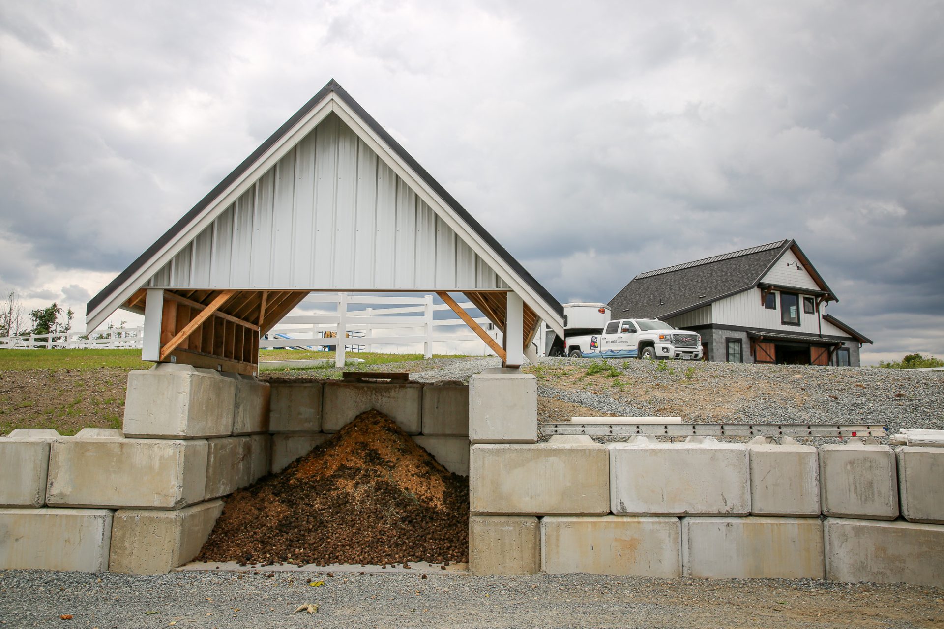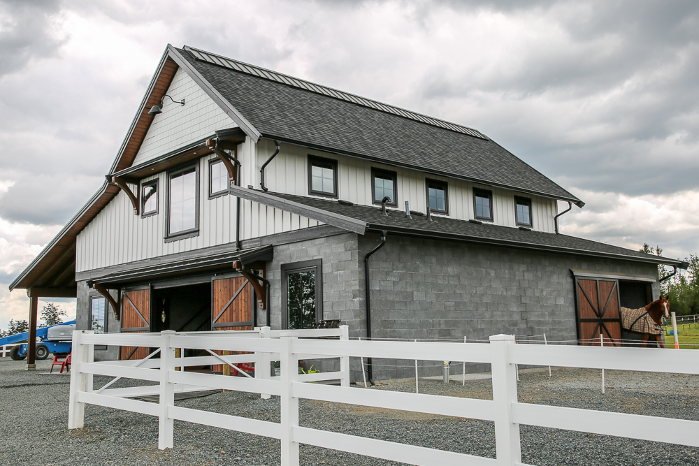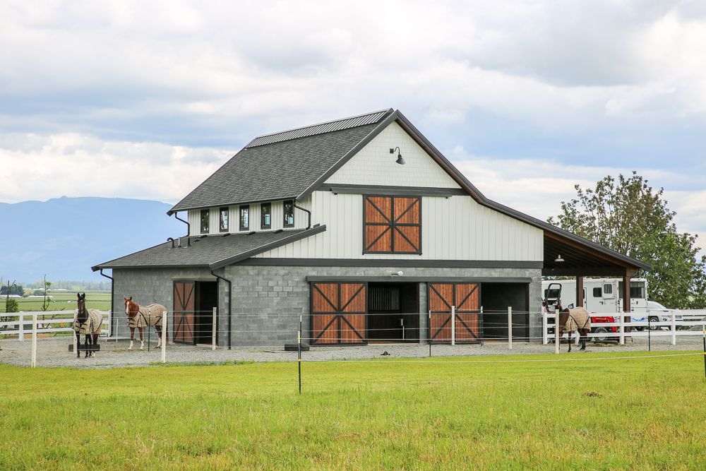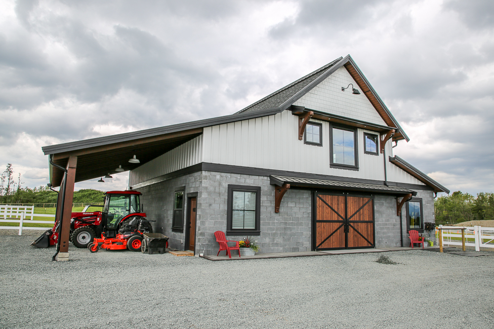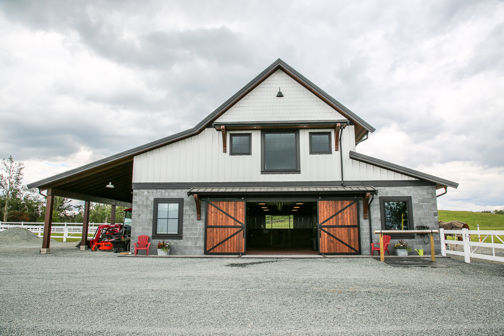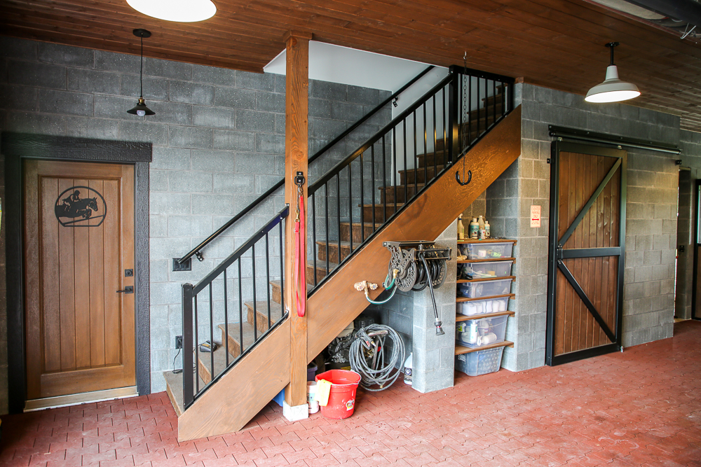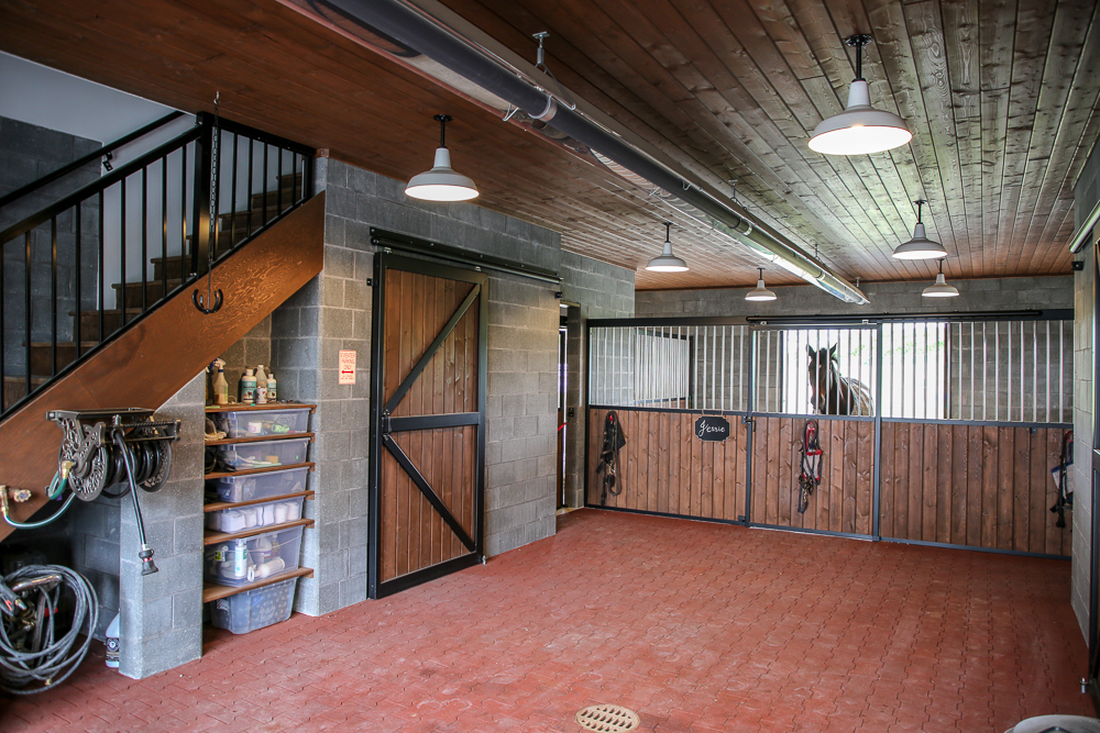 Masonry blocks give the barn a modern look and are extremely durable – horses cannot kick or chew through them. We opted to give the barn a wide center aisle, which saved space without compromising square footage.