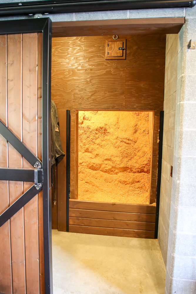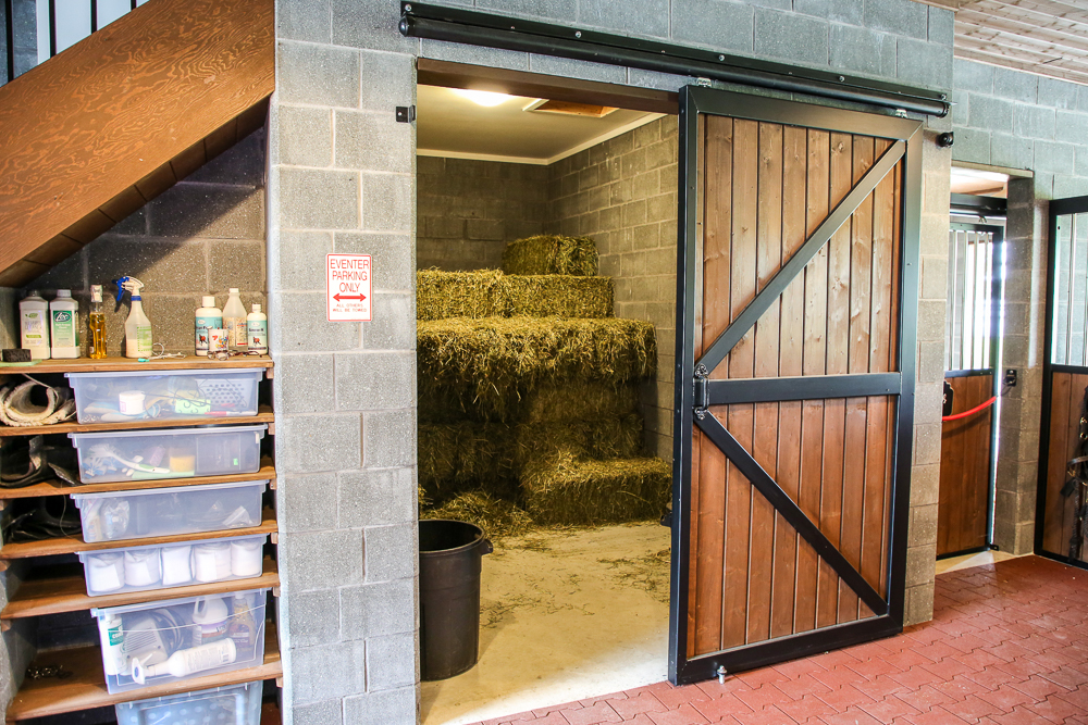 Hay is stored in two locations, upstairs and at the main level. The upstairs offers long-term hay storage with a chute to short-term storage below. The bedding room holds stall bedding in a sealed space. The bedding is blown through a small hatch above the doorway, for months of use.